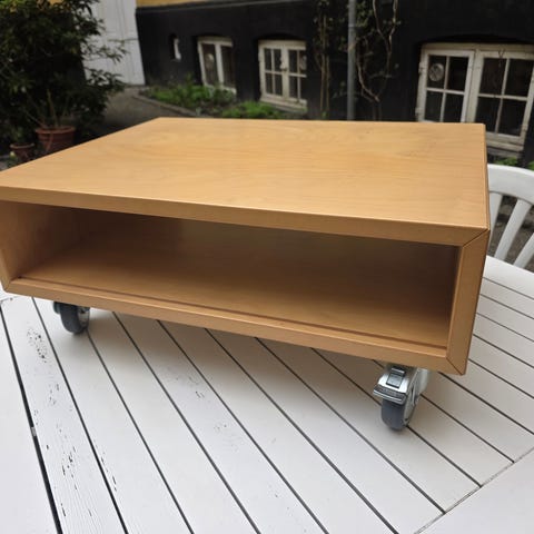 Er blevet brugt som TV-bord og opbevaring, og derfor er blevet påsat hjul på den.