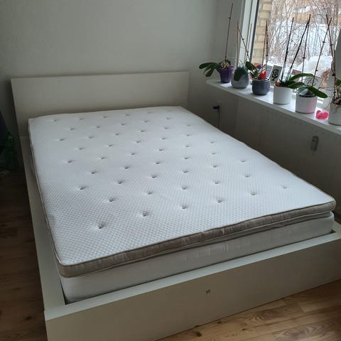 Der medfølger springmadras Hövåg (pocketfjedre/medium) i mørkegrå. Madrassen har altid været beskyttet af både tyk topmadras rullemadras og lagen, og fremstår derfor rigtig pæn og ren og er kun brugt af vores 12-årige datter. (Topmadras og rullemadras medfølger ikke)