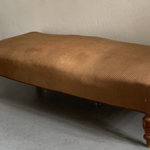 Bænk med velourpude og metalstel. Puden er fastmonteret.
