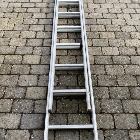 2- delt stige. 14 og 15 trin. Samlet længde 8.5 m. Incl rygningsbeslag og afstandsstykke til at renser tagrender.