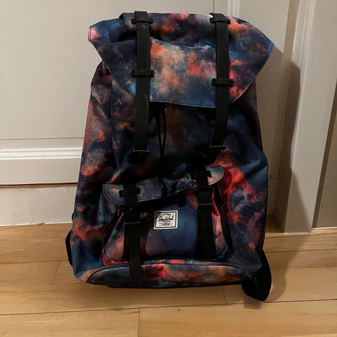 Herschel rygsæk i mørkegråt stof. Tasken har topåbning med snørelukning og klap med spænder på forsiden. Indvendigt er der stribet foer og et polstret rum, der kan bruges til opbevaring af f.eks. bærbar computer eller tablet. Rygsækken har polstrede og justerbare skulderstropper samt polstret ryg for øget komfort. Velegnet til daglig brug, skole eller arbejde.