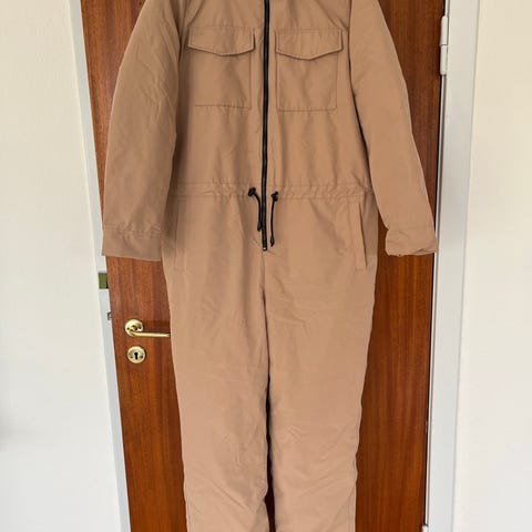 ASOS skidragt til kvinder i str. 38. Jakken er sort og fremstillet i polyester. Modellen har figursyet pasform med høj hals og gennemgående lynlås foran. Der er lange ærmer med tommelfingerhuller og bælte i taljen for justering af pasformen. Jakken egner sig til brug i køligere vejr og kan kombineres med forskellige underdele, fx bukser eller heldragt, som vist på billederne. Farve og materiale gør den velegnet til daglig brug og udendørsaktiviteter.