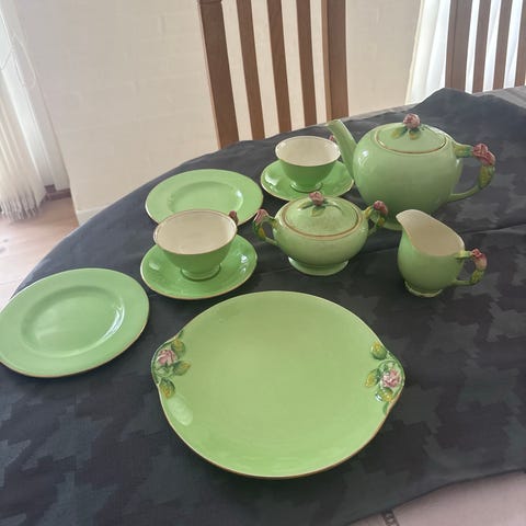 Tekanden er fremstillet i tin med profileret korpus og buet tud samt hank. På undersiden ses stempel med producenten James Dixon & Sons, Sheffield, samt patentoplysninger og årstal 1868.