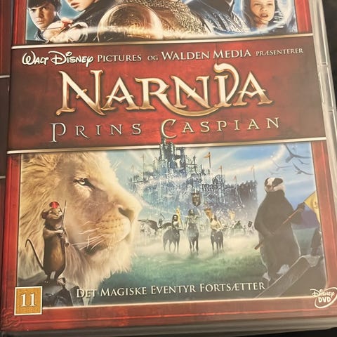 Walt Disney Narnia Prins Caspian dvd. Filmen er en fantasy-/eventyrfilm i Narnia-serien. Udgaven på billedet indeholder to versioner med mulighed for dansk eller engelsk tale. Velegnet til hjemmebrug på dvd-afspiller for dem, der ønsker at se fortsættelsen i Narnia-universet.
