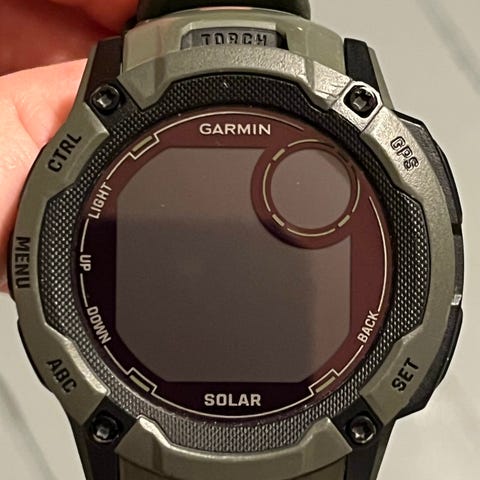 Garmin Instinct Solar sportsur i sort. Uret har solopladning (Solar) og et robust urkasse-design med tydelige knapper på siden. Remmen er perforeret og justerbar med klassisk spænde. Egnet til brug ved sport og udendørsaktiviteter, hvor der er behov for et slidstærkt digitalt ur med solcellefunktion.