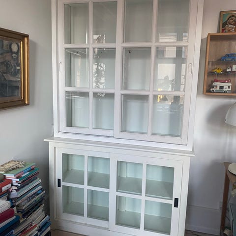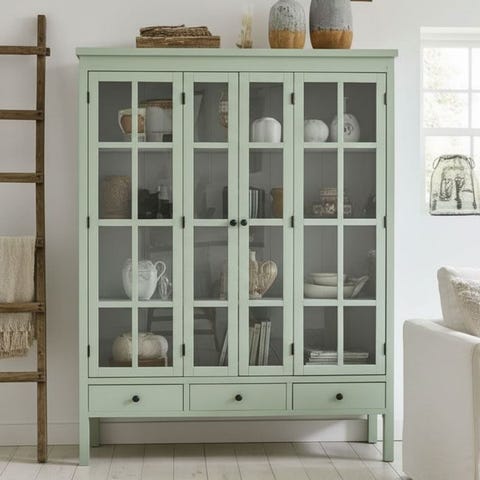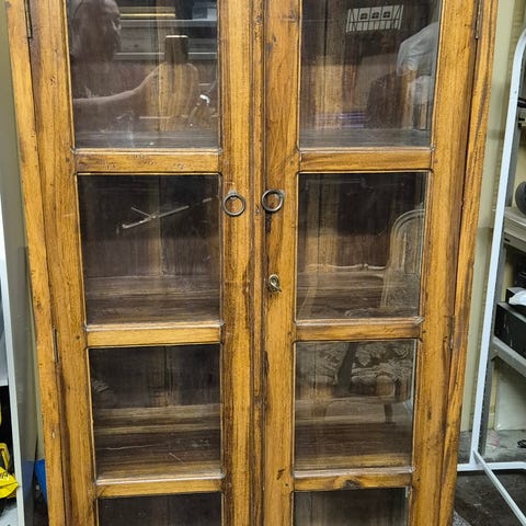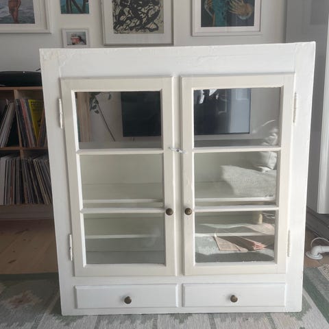 Vitrineskab i træ med glaslåger og skuffe