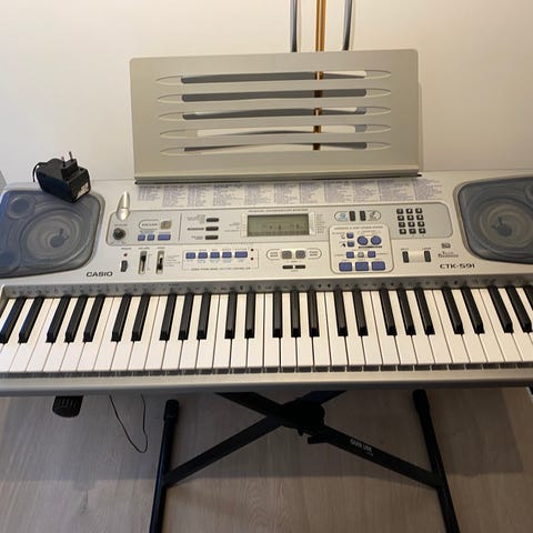 Sælger dette velspillende Casio CTK-591 keyboard, som jeg har haft fra ny. Sælges da jeg har opgraderet. Det ideelle keyboard for dig der vil i gang med at spille. Det har anslagsfølsomme tangenter, ligesom et rigtigt klaver. Fejler absolut intet. Der medfølger x-stativ. Nodestativ og strømforsyning. Kan bruges med batterier. Der er indbygget læringssystem, der hjælper dig med at lære at spille de indbyggede sange m.m.