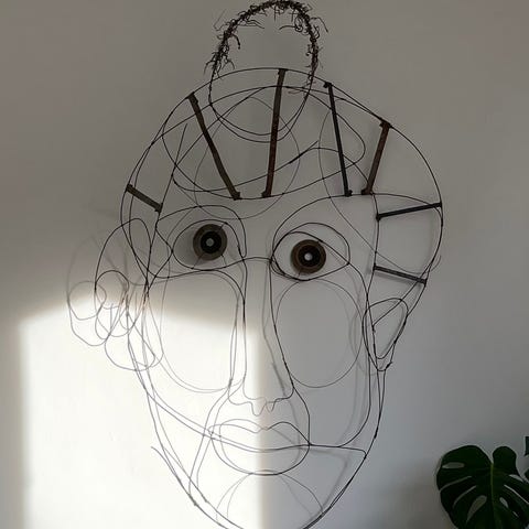 Vægdekoration formet som hoved og forpoter af en fransk bulldog i sort. Geometrisk, facetslebet udtryk, egnet som dekorativt element på væg i stue, gang eller kontor. Monteres på væg via bagplade.