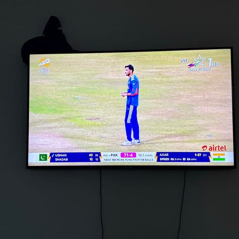 Samsung 55” fladskærms-tv. Vægmonteret tv med slankt design, velegnet til ophængning i stue eller andre rum. Skærmen er flad og egner sig til almindeligt tv-brug, streaming og tilslutning af eksterne enheder via de tilgængelige porte på modellen (ikke vist på billederne).