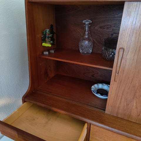 Smuk skænk i teaktræ sælges pga. flytning. Fremstår meget velholdt. Der medfølger to nøgler.