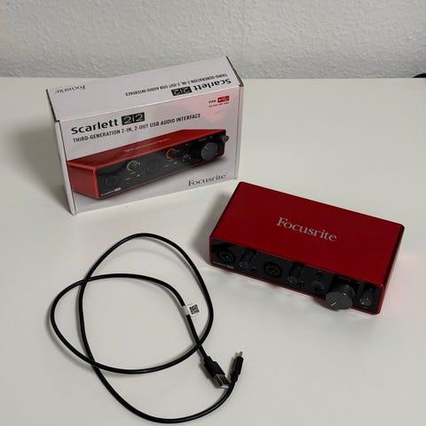 Focusrite Vocaster One audiointerface med USB-tilslutning. Kompakt enhed i sort med rød kant, velegnet til optagelse af tale og lyd via computer. Forsiden har to store drejeknapper til niveaukontrol samt knapper til funktioner som mute og monitor. Bagsiden har indgange og udgange til mikrofon, hovedtelefoner og andre lydkilder. Leveres med USB-kabel til tilslutning til computer.