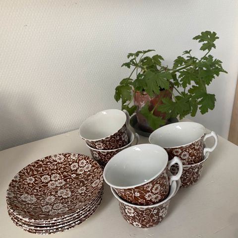 Triosæt bestående af the/kaffekop, underkop og tallerken fra engelske Burleigh Blue Calico.