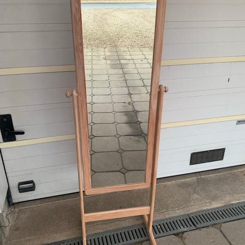 Spejl med oval form og træramme. Spejlet har en enkel ramme i træ, der egner sig til ophæng i for eksempel entré, soveværelse eller stue. Velegnet som vægspejl til daglig brug eller som dekorativt element i indretningen.