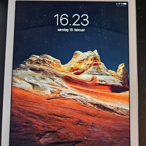 Apple iPad Air tablet med 16 GB intern hukommelse. Velegnet til brug af apps, internet, streaming og lette arbejdsopgaver. Skærmen er blevet skiftet, derfor virker fingerprint desværre ikke på den. Hjemknappen virker, men den er ikke for god. Skærmen har lidt med farverne, synes jeg.
