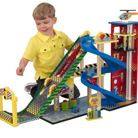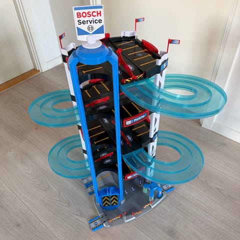 Bosch 5 etagers parkeringshus bilbane i tårnform med flere etager og spiralformede blå ramper. Sættet har parkeringspladser på hver etage, kørebaner og nedkørsel, bilelevator, bilvask, tankstation mv.
