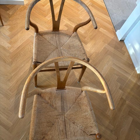 2 gamle Wegner Y stole i lakeret eg, begge fremstår med løse samlinger og en med revner i ryg. (Der vurderes mulige at lime)