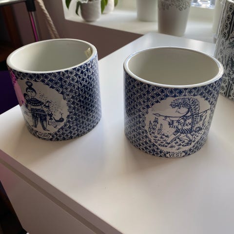 Fin urtepotte skjuler i Guirlande serien. Ingen brugs spor. Diameter 13 cm og 10,6 cm høj. I farverne rød, rosa og guld. Sender gerne men ikke med fiksfærdig.
