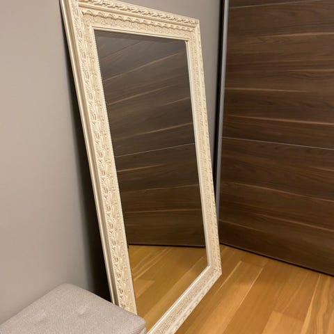 spejl med ornamenteret ramme i cremefarvet finish. Rektangulært vægspejl i fuldkropsstørrelse, egnet til brug i entré, soveværelse eller andre rum. Rammen har klassiske udsmykninger og profilerede detaljer langs kanterne, som giver et dekorativt udtryk. Kan anvendes både som praktisk spejl og som vægdekoration. 180x70cm