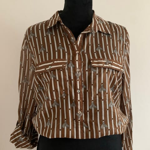 Zara skjorte til kvinder i størrelse L. Skjorten er brun med mønster og striber og er fremstillet i bomuld. Klassisk krave og knaplukning foran. Velegnet til hverdagsbrug eller mere formelle anledninger afhængigt af styling.
