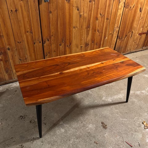 Jysk sofabord med tung plade i akacietræ. Pladen trænger til sandpapir og olie men er ellers ret flot.