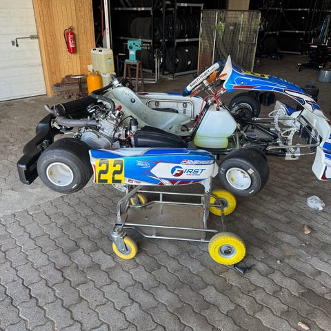 Der medfølger 2 pitvogne, hvor en af dem er med tilt-funktion for nem håndtering af karten. Derudover medfølger en masse andet udstyr, bl.a. dækskifte apparat, My Laps transponder (abonnement skal fornyes) et par blyklodser, ekstra tandhjul, hjemmelavet hjulcylinder til 4 hjul.