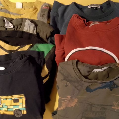 børnetøjssæt til dreng i str. 86. Sættet består af flere dele i multifarvede designs, herunder bukser med dinosaurprint, ensfarvede bukser, bukser med camouflageprint, en langærmet bluse med gravtrykmotiv samt et matchende sæt med sweatshirt og bukser med køretøjsmotiver. Tøjet er egnet til hverdagsbrug for en dreng i str. 86 og giver mulighed for at kombinere delene på forskellige måder.