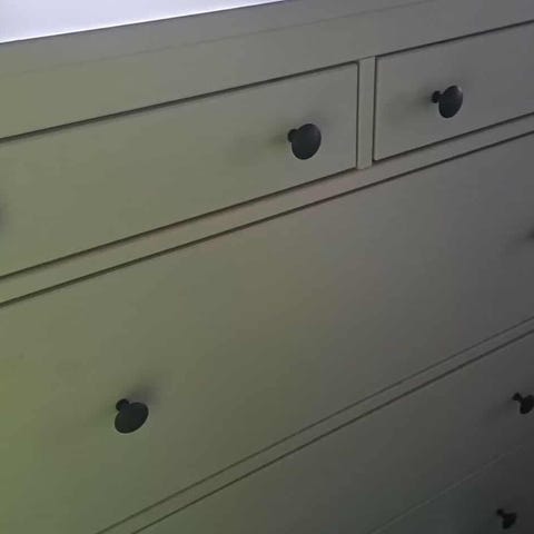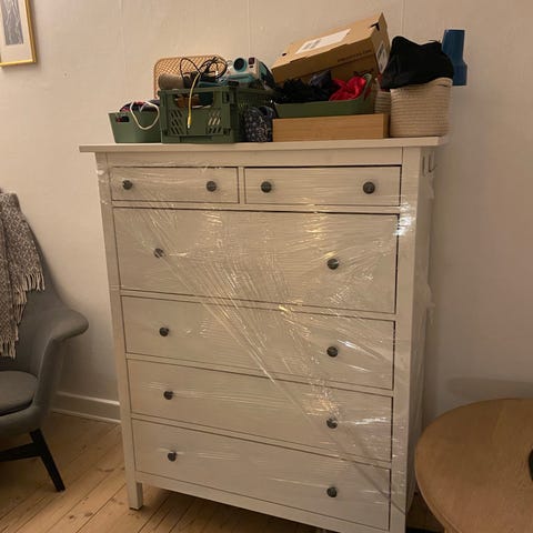 Ikea Hemnes kommode i god stand. Eneste bemærkninger er at vi mangler et greb og der er et enkelt sted hvor malingen lige er skallet af. Vi har brugt det som puslebord og monteret forlængere til samme formål.