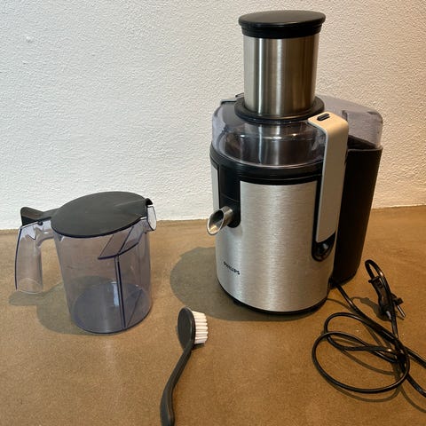 Philips juicepresser inkl. separat kande med låg. Juicepresseren består af flere dele, så den kan skilles ad i forbindelse med rengøring.