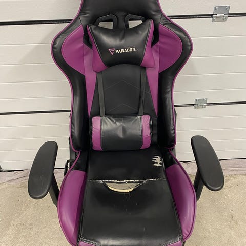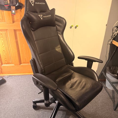 Paracon gamingstol i sort og blå kunstlæder. Stolen har høj ryglæn med integreret nakkepude og lændepude samt polstret sæde. Justerbare armlæn og drejefod med hjul giver mulighed for at tilpasse siddepositionen. Egnet til brug ved computer, gaming eller skrivebord.