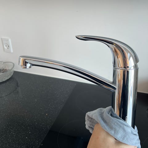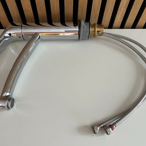 Køkkenarmatur i krom med étgrebsbetjening. Armaturet har en lang, svingbar tud og leveres med tilslutningsslanger og monteringsbolt som vist på billederne. Velegnet til montering i køkkenvask eller bordplade med hul til enkelt armatur.