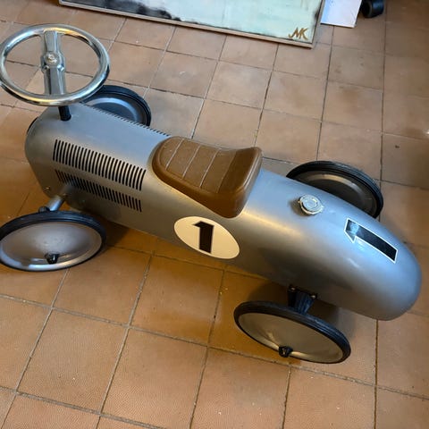Vilac retro gåbil i fin stand - brugsspor ses på billedet af rattet. Fungerer fint, kan dreje uden problemer. Har kun været brugt indendørs.