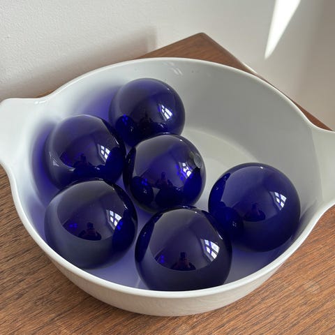 Flotte massive glaskugler med dekorative mønstre og luftbobler indeni. Fremstår i pæn stand uden skår. Perfekte som dekoration i hjemmet eller til samling.