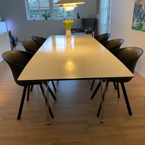Ilva spisebord i hvidt design. Bordet er rektangulært med let afrundede hjørner og står på slanke ben i metal. På billederne ses bordet både i standardstørrelse og forlænget med tillægsplader i samme hvide overflade. Velegnet som spisebord i køkken eller spisestue med plads til flere stole rundt om bordet. Overfladen fremstår glat og ensartet, og bordet passer ind i et lyst, moderne interiør. 6 stole medfølger