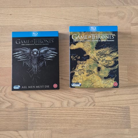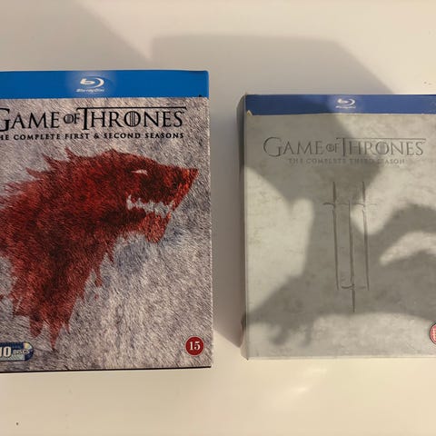 Game of Thrones Blu-ray sæsonbokse. Indeholder tv-serien Game of Thrones udgivet på Blu-ray. Boksene omfatter flere sæsoner af serien, med afsnit fordelt på flere diske samt ekstramateriale som angivet på bagsiden af omslagene. Egnet til afspilning på Blu-ray-afspillere, der understøtter de viste region- og sprogindstillinger på covers.