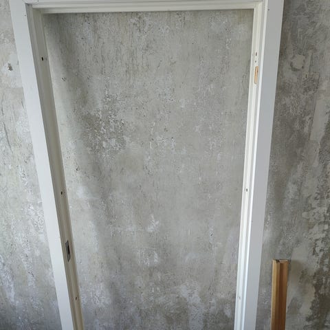 Indvendig dør med karm i hvid farve. Døren fremstår som en glat pladedør med greb og beslag monteret. Karmen er ligeledes hvid og beregnet til indendørs brug.
