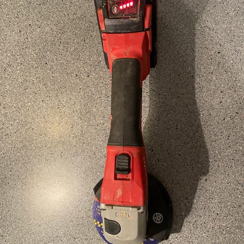 Milwaukee vinkelsliber med batteri. Trådløs model med sidehåndtag og aftageligt batteri, egnet til skære- og slibeopgaver i metal og andre materialer. Batteripakken på billedet medfølger efter sælgers oplysninger. Velegnet til brug i værksted, garage eller på byggeplads, hvor der er behov for mobil slibning og skæring uden ledning.