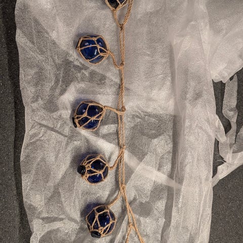 To ophængs glaspynt til sommerhus, havestuen eller andet. De er hver med et sneglehus og en rund ting. De er uden skader på ender og diverse.