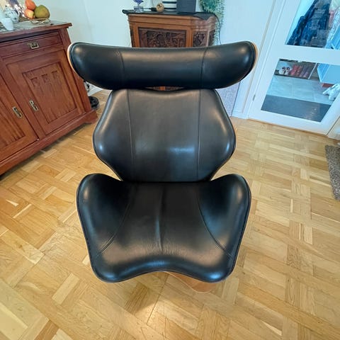 Lænestol med fodskammel læder træ mrk.Toshiyuki Kita.