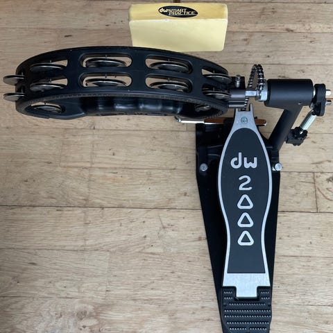 Armen på stativet gør, at tamburinen kan placeres tæt på. Man kan sikkert montere andet percussion, hvis man vil.