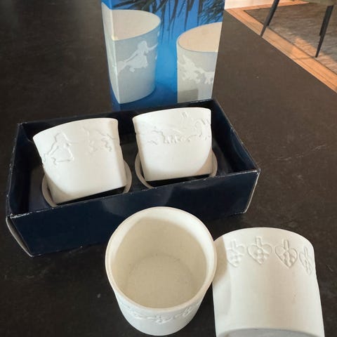 Fine fyrfadslysestager i biscuit porcelæn. Pris pr sæt.