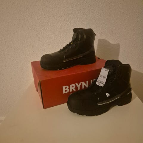 Brynje sikkerhedsstøvler med BOA lukning i størrelse 43. Støvlerne er sorte med kraftig, mønstret ydersål, der giver godt fodfæste. Overdelen er i syntetisk materiale med forstærkninger ved tå og hæl. BOA-snøresystemet gør det muligt at justere pasformen ved at dreje hjulet på skaftet. Indvendigt er der polstret skaft og pløs for øget komfort. Velegnet som arbejds- eller sikkerhedsfodtøj, hvor der er behov for støttende og robuste støvler.