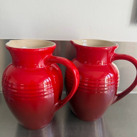 Le Creuset kande i rød stentøj med hank og hældetud. Velegnet til servering af vand, saft eller andre drikke ved bordet. Klassisk design med glaseret overflade, der er nem at rengøre. Kan sendes.