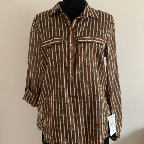 Zara skjortebluse med stolpelukning i lille str. L. Skjorten er brun med hestemønster i bomuld. og fremstillet i bomuld.