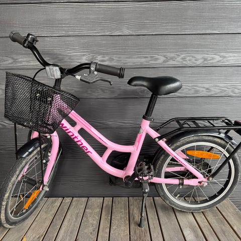 Winther børnecykel med 16" hjul i pink. Cyklen har lav indstigning, kædeskærm, bagagebærer, støtteben og kurv foran. Velegnet som hverdagscykel til barn i den størrelse, der passer til 16" hjul.