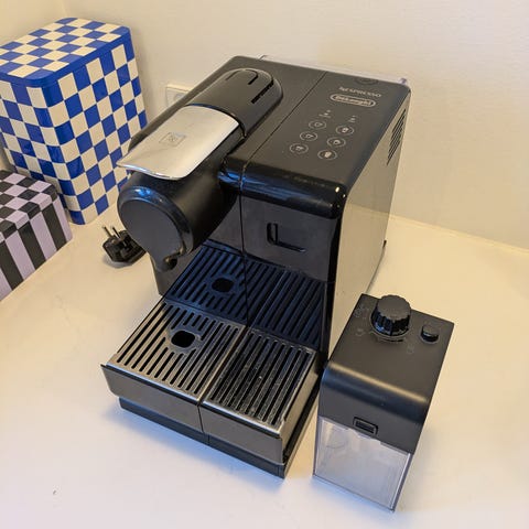DeLonghi Nespresso Lattissima kaffemaskine i hvid og sort med mælkeskummer til kapsler.