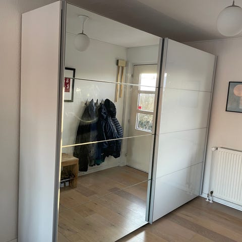 Smukt garderobeskab med bøjlestang, hylder og spejl på skabsdøren. Rummeligt og godt indrettet. Perfekt til entré, børne- eller soveværelse.
