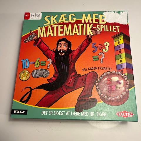 Tactic Skæg med tal brætspil. Spillet er baseret på DR-figuren Hr. Skæg og handler om tal og simple regneopgaver. I æsken findes spilleplade, kort, brikker, klokke og vejledning på dansk. Spillet er egnet til børn, der skal øve talforståelse og regning gennem leg, og kan spilles af flere deltagere samtidig.