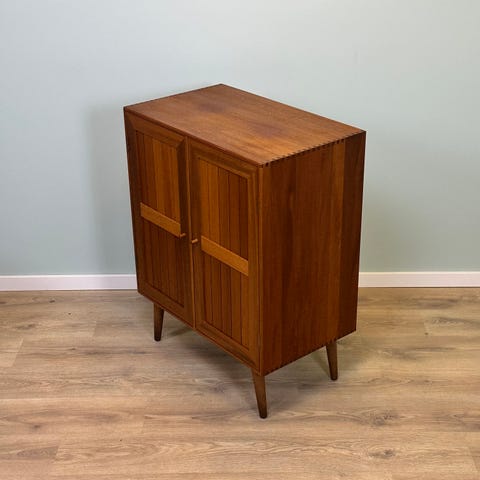Barskab i teaktræ,med hylde der kan justeres i højde,efter behov.