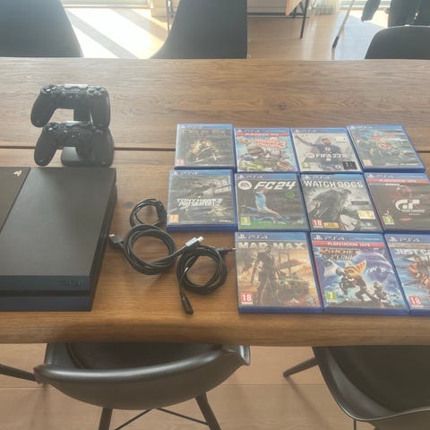 Fc24, fifa22, Lego avengers, ninjago, super heroes 2, 2 star wars spil, incredibles, wolfenstein, rayman legends, thief (uden æske) og Lego Dimensions med en masse udvidelser. Dimensions baserne er ser, men der mangler en del af lego figurene og klodserne.