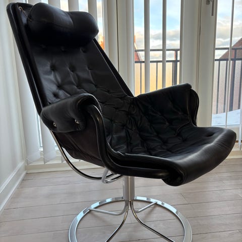 DUX Bruno Mathsson lænestol i sort læder. Stolen har polstret sæde og ryg med knaplukning samt integrerede armlæn. Den står på en rund drejefod i metal, som giver mulighed for rotation. Egnet som komfortabel siddeplads i stue, læsehjørne eller kontor.